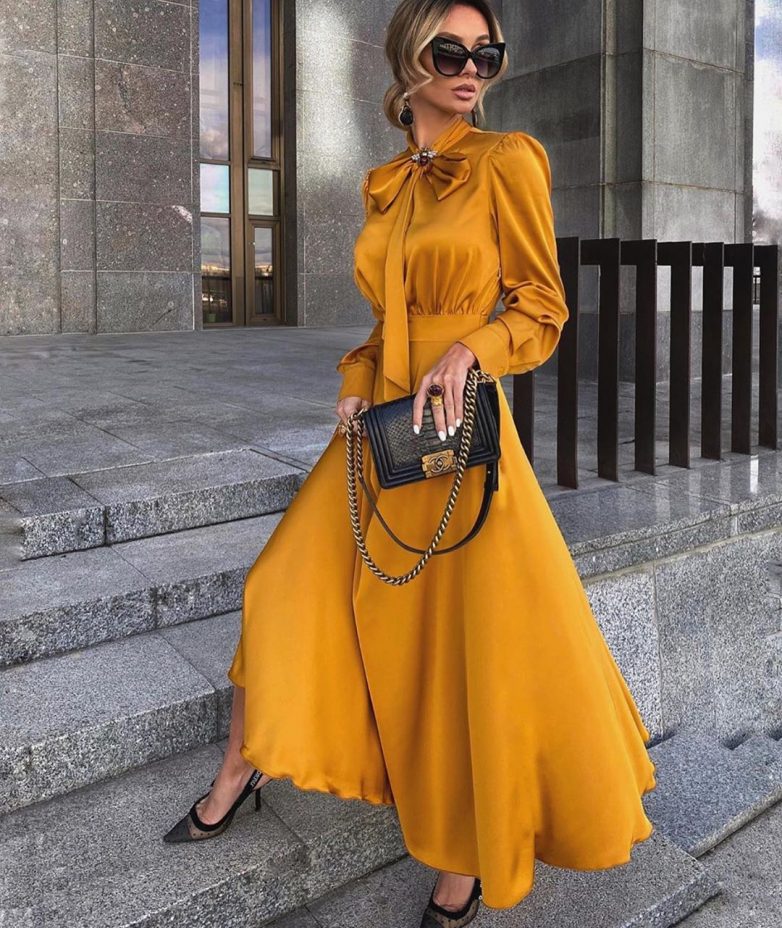Фасоны платьев макси с рукавами из плотных тканей могут красиво подчеркнуть талию, а с завышенной талией значительно улучшат пропорции фигуры, визуально удлинив ноги.