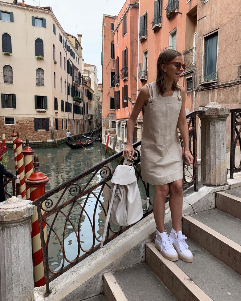 Чудесный образ получится и с обычным бежевым платьем, которое прекрасно будет работать с белыми ботинками и рюкзаком.
