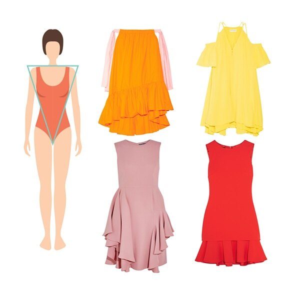 Если у тебя спортивная фигура с широкими плечами и узкими бедрами, присмотрись к платьям с каскадом воланов или крупной оборкой внизу. Юбка-солнце – однозначно твоя модель, а вот от трендовых топов с открытыми плечами лучше отказаться, вместо них выбирай расклешенные сарафаны.