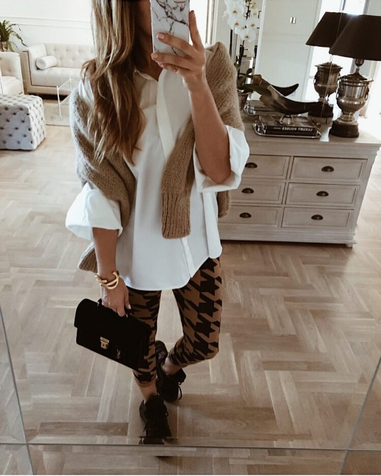 с брюками с завышенной посадкой, подчеркивая тонкую талию и изящный стиль;