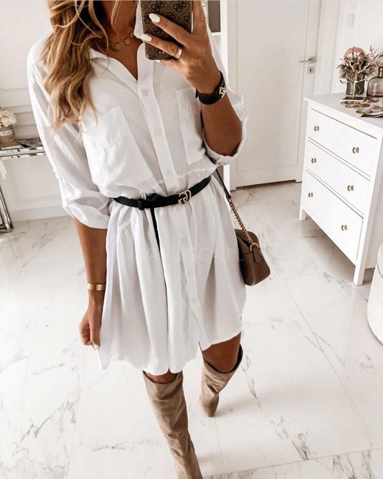 Модницы выделили для платья-рубашки в своем гардеробе почетное место. Эта удобная вещь универсальна. Дизайнеры модной одежды придумывать все новые сочетания с базовой моделью, которые позволяют взглянуть на нее под новым свежим углом. Легкое платье-рубашка с коротким рукавом и закругленными разрезами по бокам хорошо гармонирует с белыми кроссовками или босоножками на сплошной подошве. Их носят как в свободном варианте, так и под поясок.