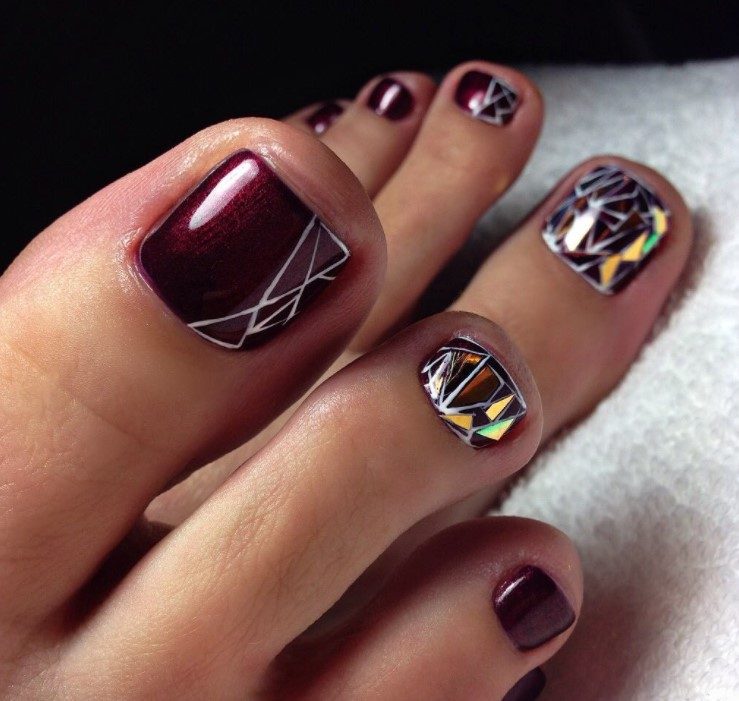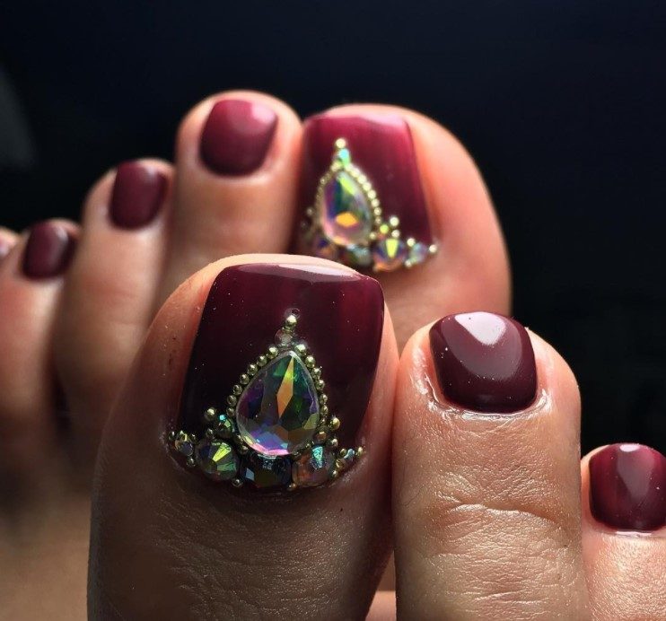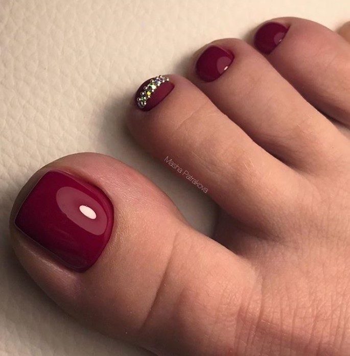 Изысканно и очень нарядно смотрится бордовый педикюр со стразами, когда пара ноготков окрашена золотым или серебристым лаком.