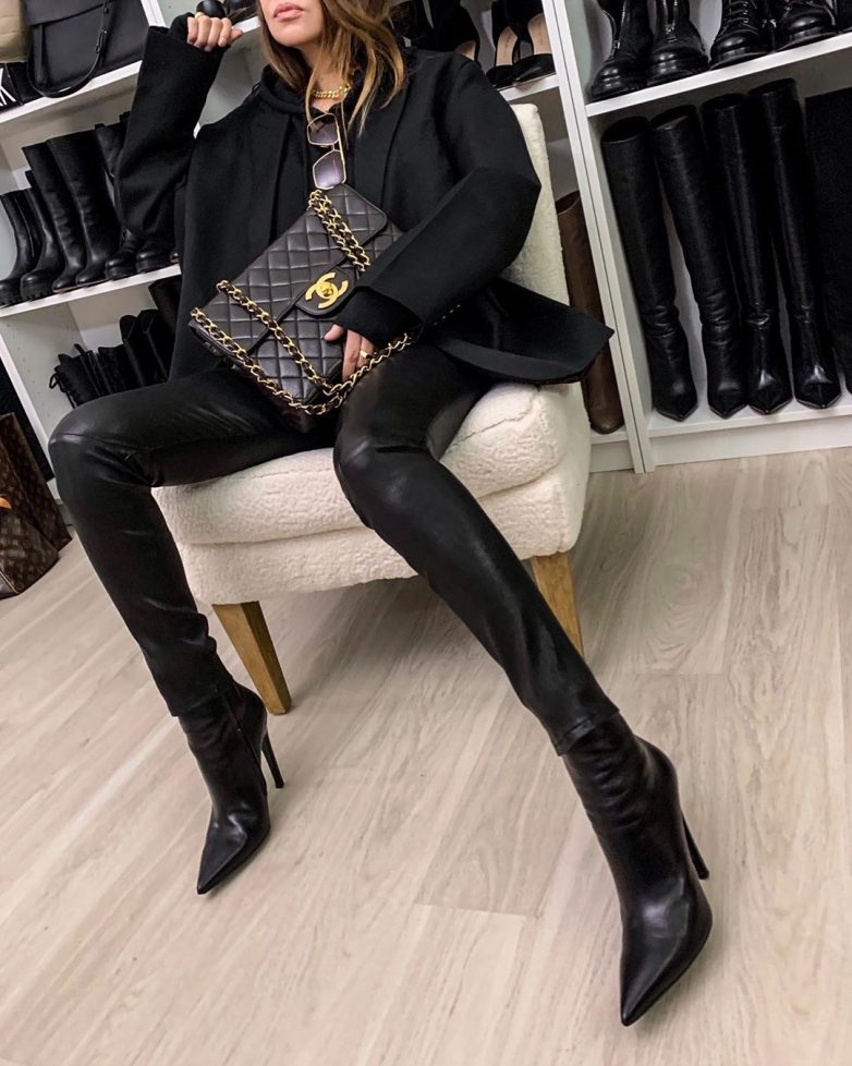 Узкие кожаные брюки, особенно темных тонов, прекрасно сочетаются со многими вещами: кардиганами, кожаными плащами, тренчами, куртками. В зависимости от того, какой вы подобрали верх, и какой образ хотите создать подбирается обувь. Это могут быть туфли на высоком каблуке, ботильоны, укороченные сапожки, ботинки.