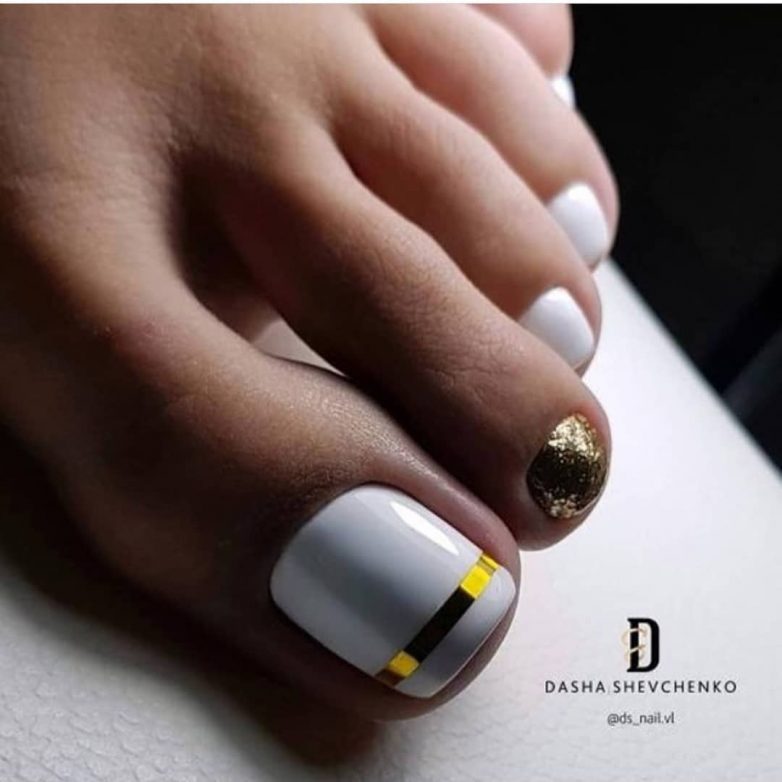 Педикюр с тонкими лентами из фольгиВ последнее время нейл-мастера все чаще в создании красивого педикюра используют различные клейкие ленты из фольги.