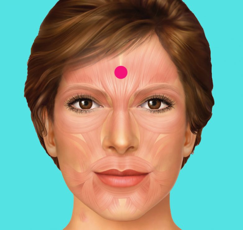 Точка №1. Расположена на лбу между бровями. Ее можно сравнить с «третьим глазом».