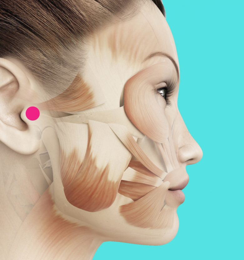 Точка №6. Расположена между наружным слуховым проходом и краем нижнечелюстного сочленения в зоне ушного козелка.