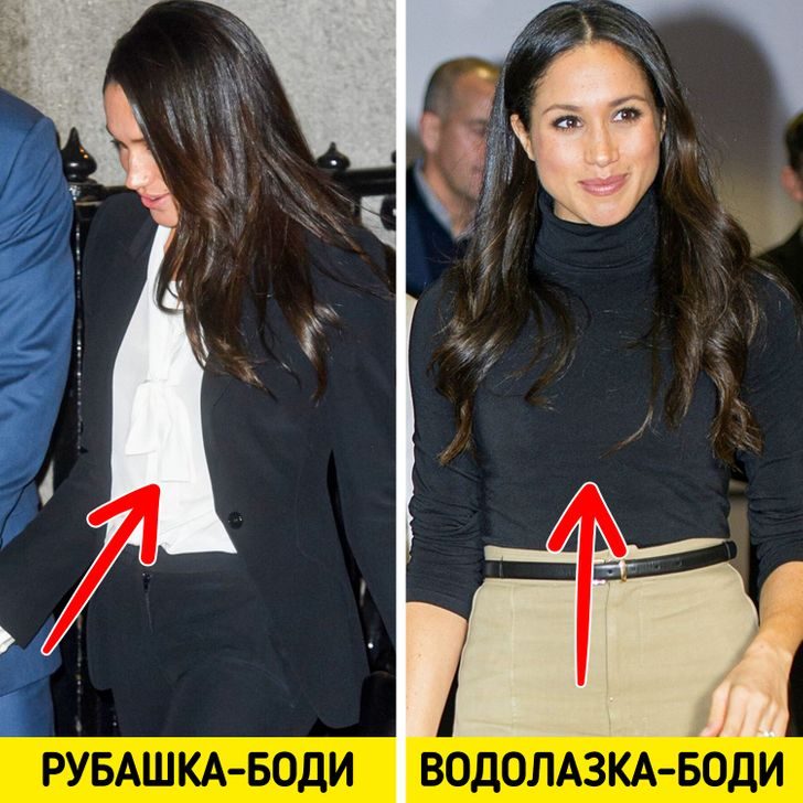 Меган Маркл предпочитает обычным блузкам и топам боди. Они практичны, не образуют складки и делают образ более аккуратным. Но самое главное, надевая боди, супруга принца Гарри может не беспокоиться о том, что блузка может выбиться наверх.