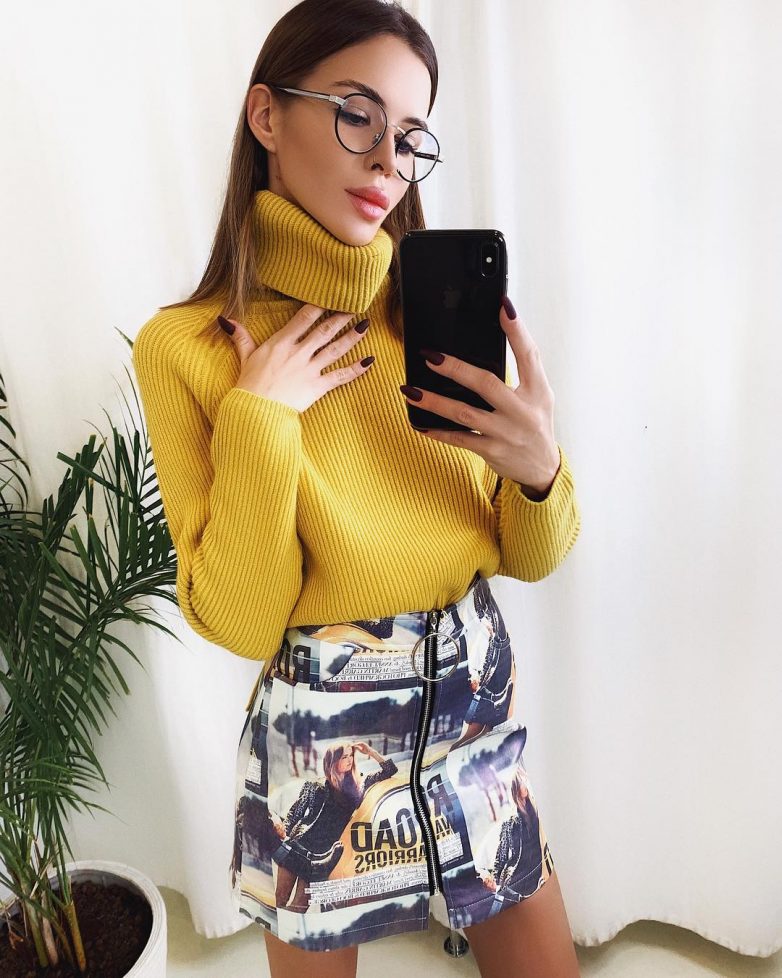 Современные модницы комбинируют желтый свитер с юбкой-солнце или мини. Романтичный образ будет более эффектным, если верх будет в модном горчичном оттенке.