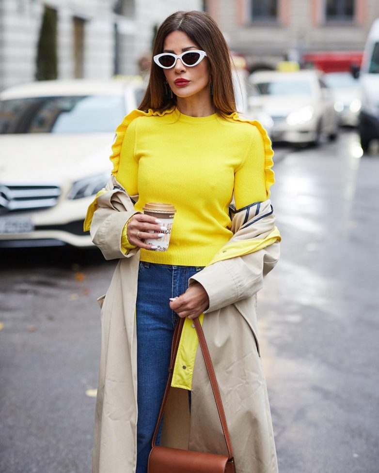 В гардеробе каждой женщины обязательно есть модные джинсы. Это могут быть бойфренды, скинни, классический фасон или бананы. К ним можно подобрать абсолютно любой фасон свитера и джемпера. Для уличного стиля дамы выбирают удобные рваные бойфренды и желтый свитер оверсайз.