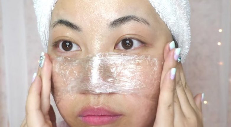 Затем девушка прикрывает кожу двумя слоями пищевой пленки, оставляя ноздри открытыми.