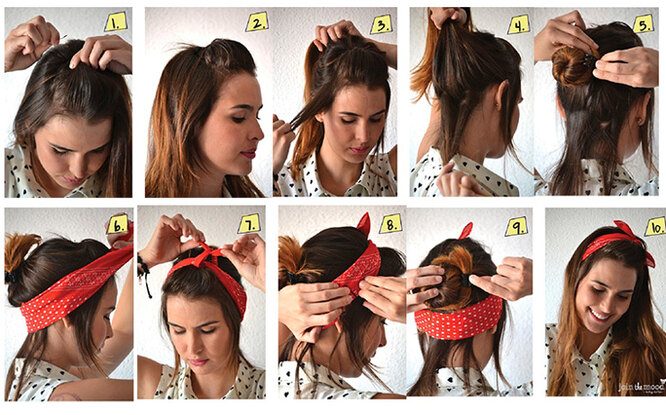 Такой способ подойдет для причесок в стиле пин-ап и не только. Ты можешь сделать бандану своей “фишкой” и носить ее хоть каждый день. Как красиво носить такой платок на голове? Собери волосы у лица и закрепи заколками назад, создавая объем. Выпусти несколько прядей с боков и сзади, оставшиеся пока закрепи. Оберни свернутую бандану вокруг головы, завяжи аккуратный узел сверху. Для надежности зафиксируй ее заколками по бокам. Распусти волосы, готово!