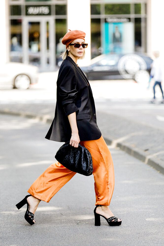 Классическое сочетание, которое можно найти в любой цветовой схеме. И неудивительно, ведь выглядит это очень эффектно! Для запоминающегося летнего образа тебе будет достаточно синего костюма и ярких оранжевых аксессуаров, а обувь можно подобрать в тон наряду.
