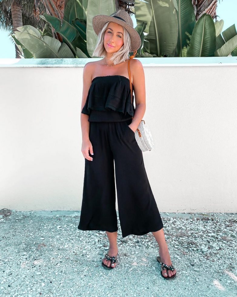По своей сути комбинезон в офисном стиле представляет собой уже готовый деловой костюм. Для работы стоит выбрать легкий материал или костюмную ткань, брюки классического кроя со стрелкой, а верх может быть с длинными рукавами, и с оголенными плечами. Палитра должна быть выдержанной в одном тоне: бежевый, синий, черный, нюдовый и другие спокойные оттенки.