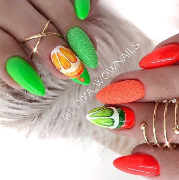 Оранжевый оттенок можно комбинировать с более родственными цветами. Насыщенный зеленый в сочетании с ярко-оранжевым цветом позволяет создать трендовый маникюр, который закончит образ сногсшибательной красотки.