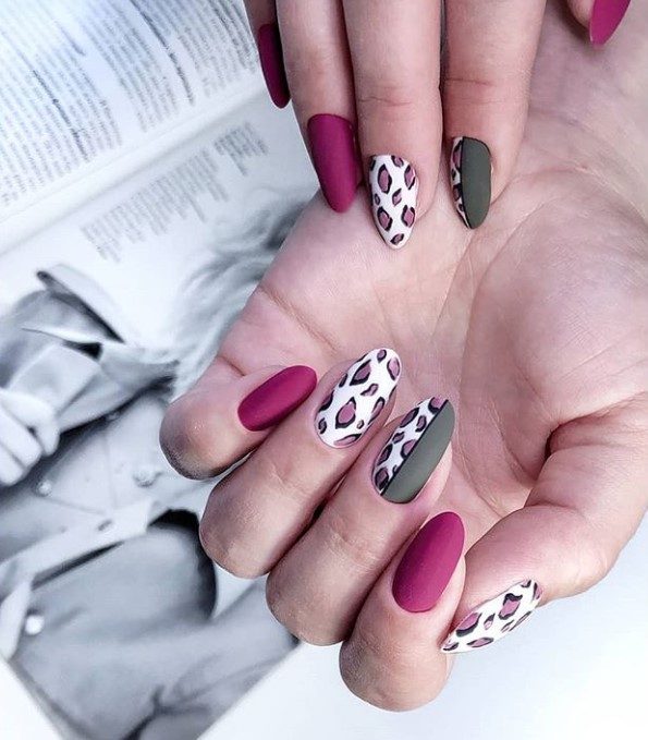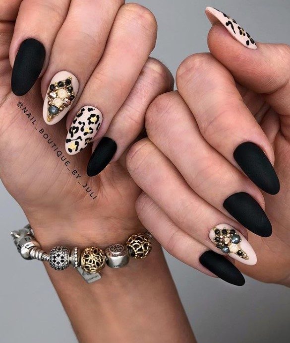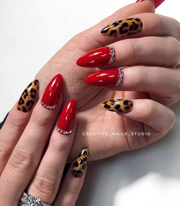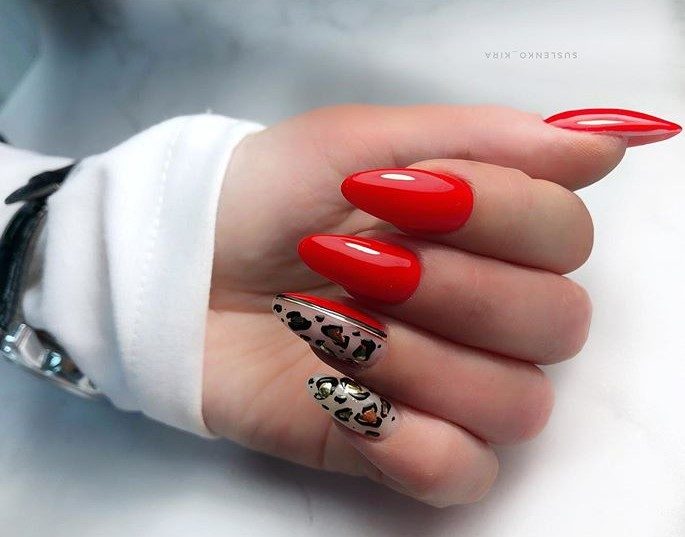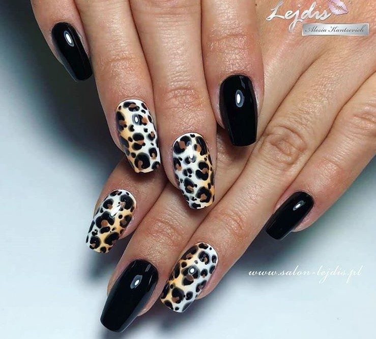 Оригинальности вашему образу придаст яркий маникюр в комбинации с леопардовым узором. Отдельные ногти должны быть яркими, глянцевыми. Один можно сделать полностью леопардовым, а второй наполовину повторяющий оба варианта. Таким образом вы подчеркнете свою готовность к чему-то новому, указав, однако, на постоянство.