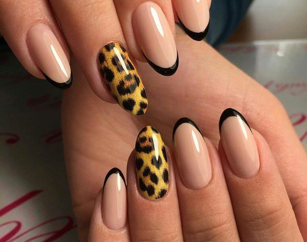 Леопардовый принт в стиле френча — довольно необычное, но в той же мере оригинальное решение. Можно отделить рисунок от основного фона или оставить границу открытой, без четкого контура.