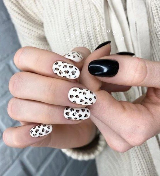 Довольно оригинально выглядит абстрактный маникюр с леопардовыми вставками. Темный, возможно черный, основной цвет и два контраста в виде леопардовых фрагментов на белом фоне.