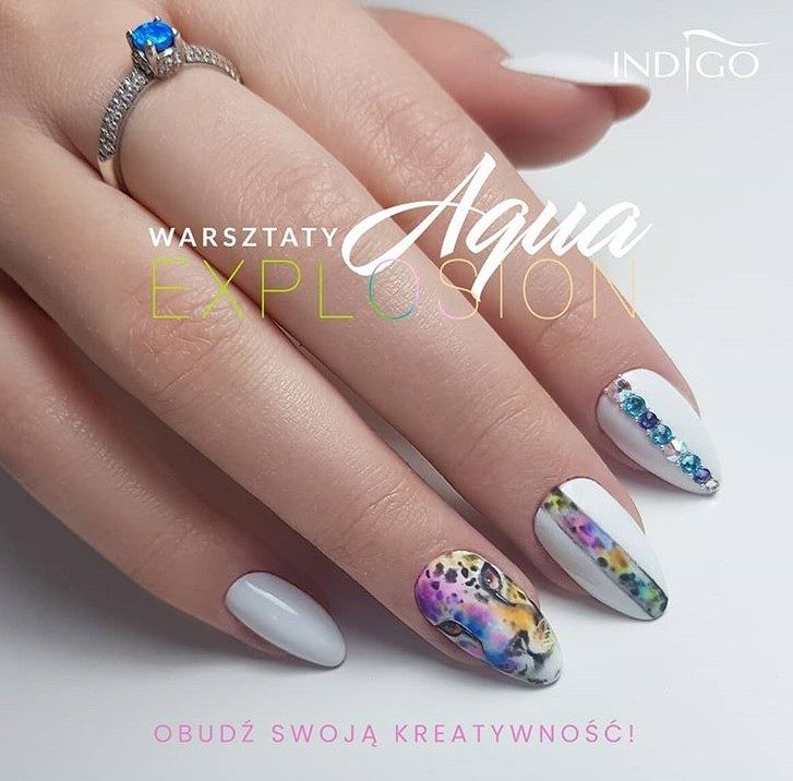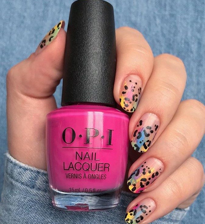 Прекрасно смотрится такой узор на прозрачной основе. Ноготь остается естественным, но с небольшим акцентом. Пятнышки можно делать как однотонными, так и разноцветными. Но каждое из них должно быть окаймлено черным прерывистым контуром.