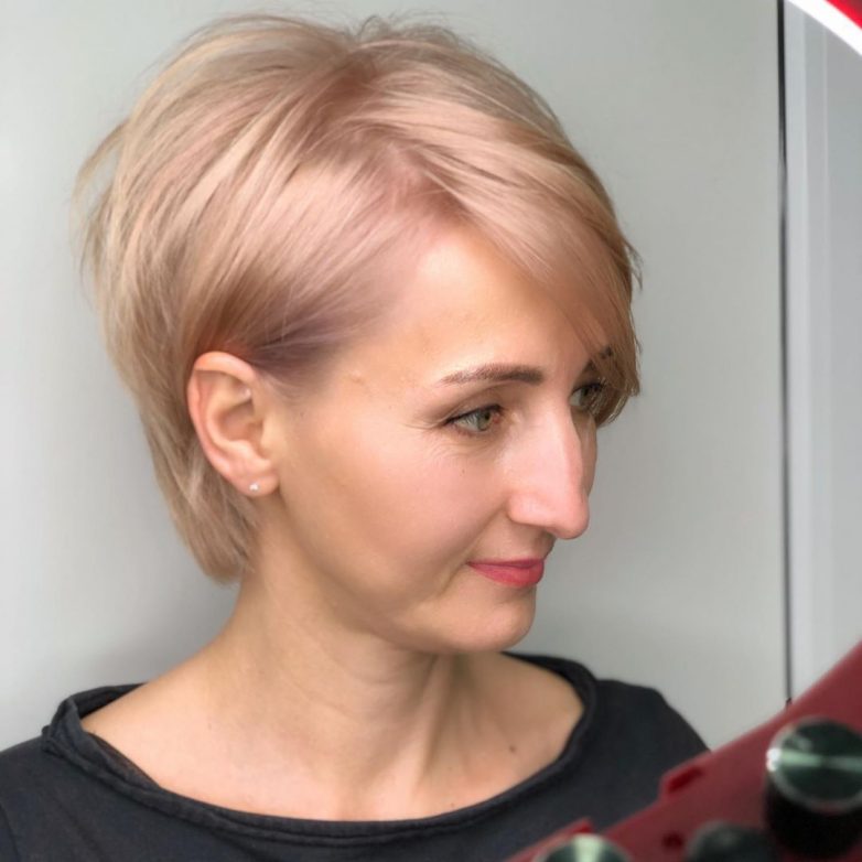 Пикси имеет массу преимуществ. Во-первых, она создает очень эффектный и молодой образ женщины, во-вторых, стрижку легко укладывать и также экономится время на уход за волосами. Челка в пикси – это не только главный акцент стрижки, но и возможность скрыть многие возрастные изменения на лице. Укладка – челка набок позволит придать женщине особую роскошь и получить заметный омолаживающий эффект.