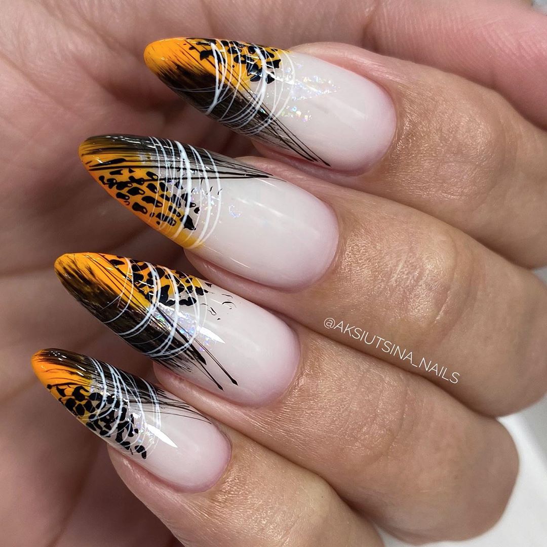 Нюдовая и пастельная палитра обещает быть востребованной осенью и зимой текущего года. Геометрия в виде полосок различной толщины смотрится лаконично и женственно на бежевой основе. Флористические мотивы и хищные принты смотрятся оригинально на коротких ноготках как овальной, так и квадратной формы.