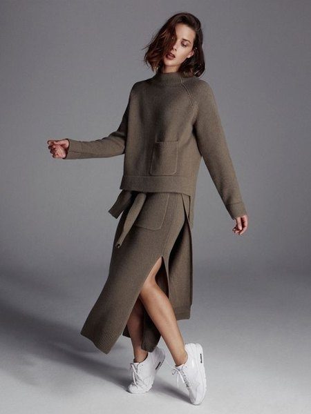 Он может быть шерстяным или хлопковым — на ваше усмотрение. Если вы любите больше спортивный стиль, то выбирайте костюм с худи. А если предпочитаете хотите более классический вариант, то с джемпером без капюшона. Такой костюм можно сочетать и с кожаной курткой и с пальто — такой look невозможно испортить ничем. Что касается цвета — в фаворе осени беж, горчичный и темно-зеленые оттенки. Но это все всего лишь рекомендации. Если вам по душе красный — смело выбирайте его и создавайте настроение.