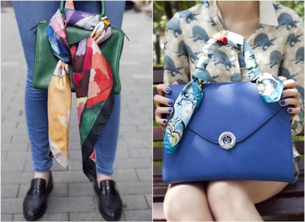 Например, среди множества советов от экспертов, можно выделить следующий- если сумка оформлена достаточно ярко, то крайне не рекомендуется завязывать яркий цветастый платок, так как он сольется с красками сумки и не будет виден.