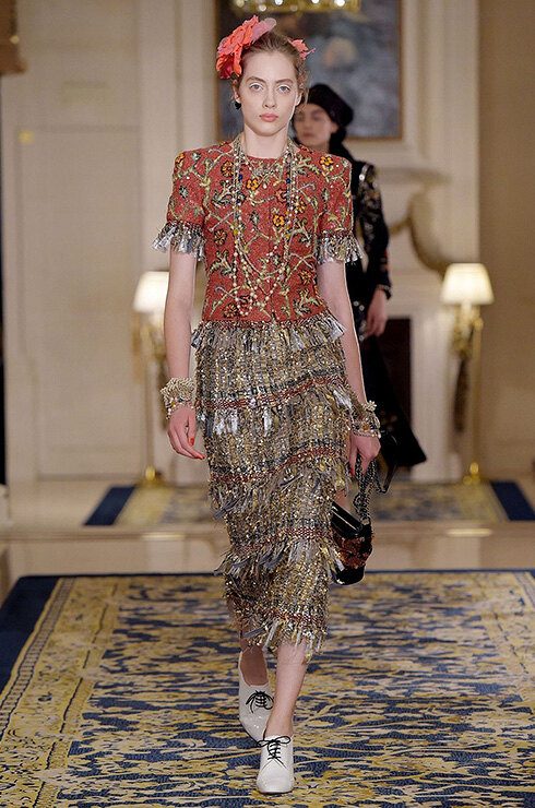 На показе Chanel платье обыграли в ретро-стиле, дополнив ботильонами в стиле 20-х, несколькими нитями бус и крупными браслетами, а также цветком в волосах. Эмма же «проголосовала» за современность — надела лаконичные черные босоножки и отказалась от множества аксессуаров.