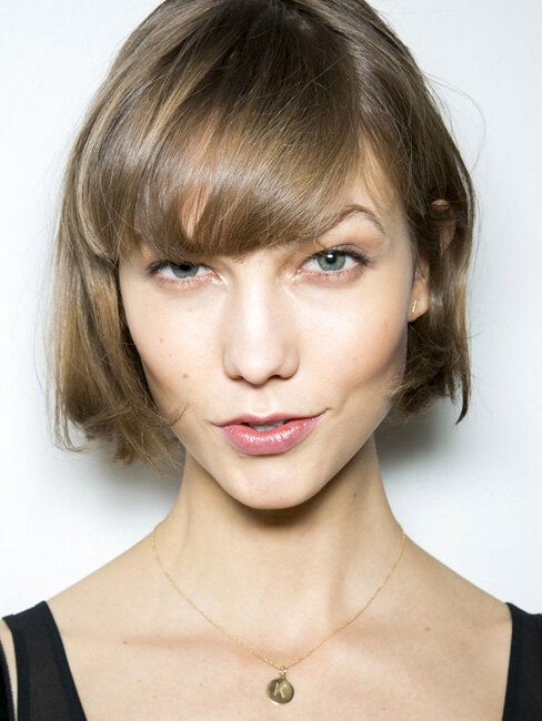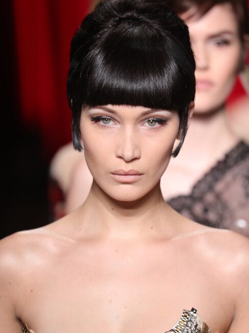Волосы оттенка «вороново крыло» и безупречно ровная линия длинной челки — это основные элементы прически. Основная масса волос может быть убрана в пучок, ракушку либо быть постриженной под каре.