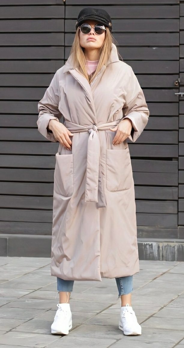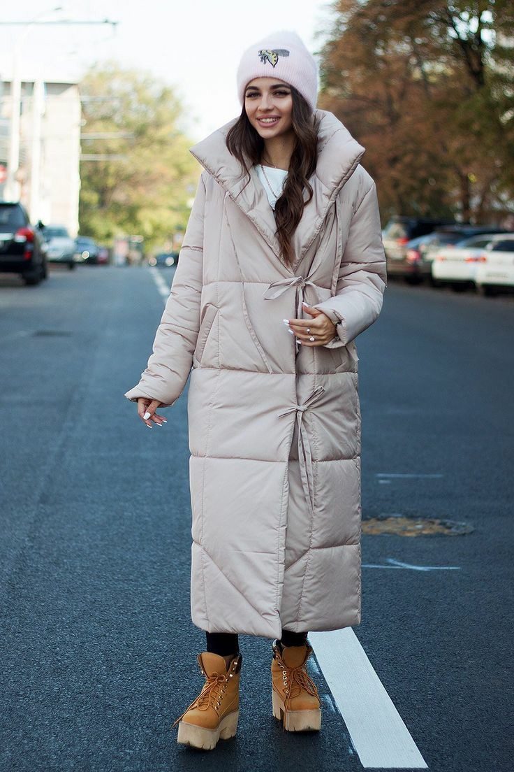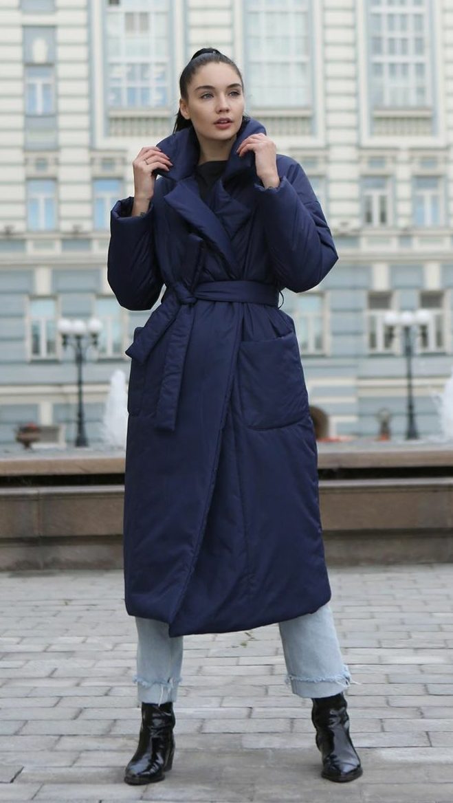 Пальто-пуховик с капюшоном длиной до колена или ниже с поясом на талии будет смотреться очень женственно и подарит своей хозяйке комфорт даже в сильные холода.