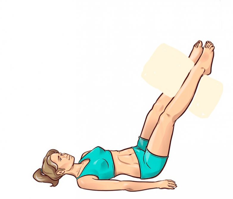 Второе упражнение нужно выполнять лежа на спине, зажав подушку ступнями и нижней частью ног, я руки расположить по бокам ягодиц. Сделайте вдох, а затем на выдохе плотно сожмите подушку и тяните ноги вверх, пока они не будут находиться на расстоянии около 60 градусов по отношению к поверхности пола. Втяните живот и немного подвиньте ягодицы вперед, чтобы минимизировать нагрузку на позвоночник.