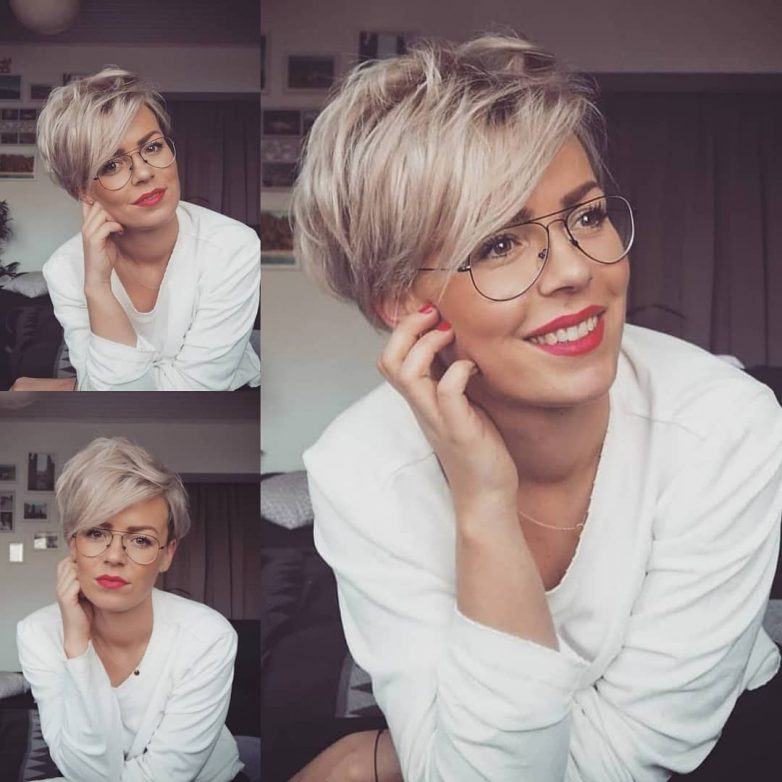 Если вы любите короткие стрижки, вы можете обратиться к короткой пикси, которая может быть украшена стильной косой челкой, в том числе и рваной. Градуировка на волосах здесь вполне уместна, что сделает образ еще более дерзким и самобытным.