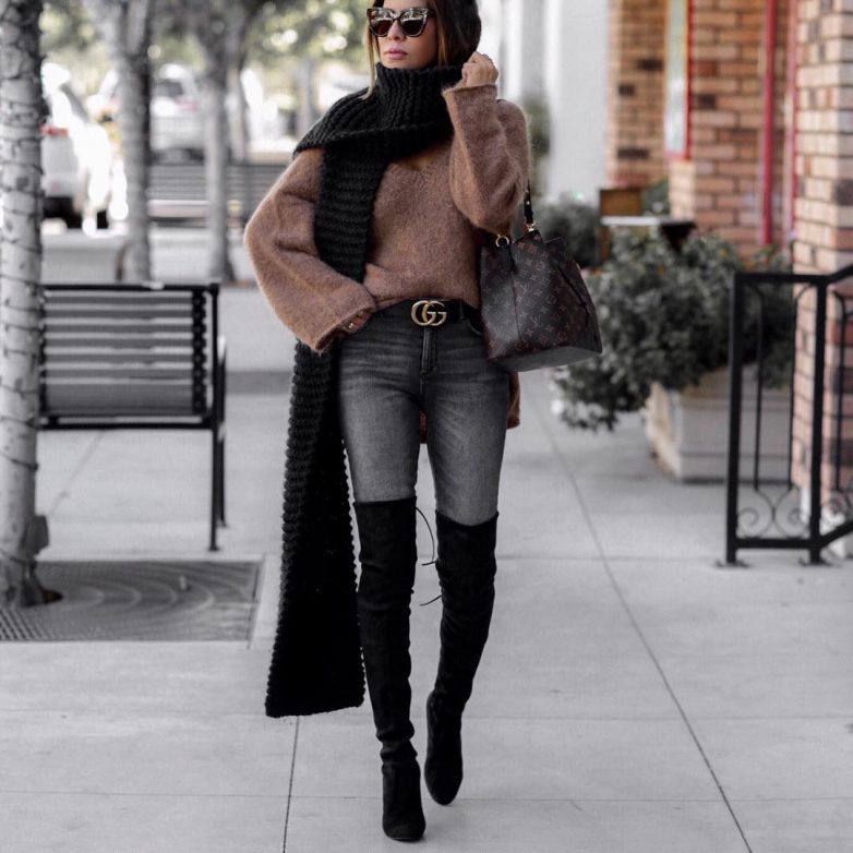 В зависимости от ваших предпочтений, этой зимой вы можете облачиться в джинсы скинни, прямые классические, клеш, бойфренды и даже мом джинсы. Сочетать такой низ лучше всего с однотонными свитерами, полуверами, свитшотами. Не менее интересный образ с джинсами вы можете получить, если наденете удлиненный свитер оверсайз или тунику. Не стоит забывать и про водолазки, которые вы можете дополнить интересным жакетом.