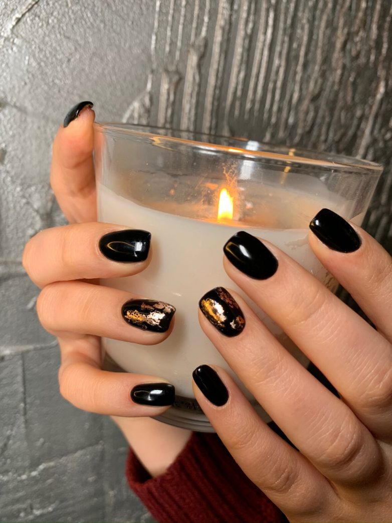 Более сдержанный, но не менее красивый вариант — дизайн с фольгой. Он не так ярко привлекает внимание, как стразы и выглядит потрясающе с элегантным вечерним платьем. Можно сделать акцент на безымянном пальце или украсить все 10, интенсивность и яркость дизайна тоже можно регулировать.