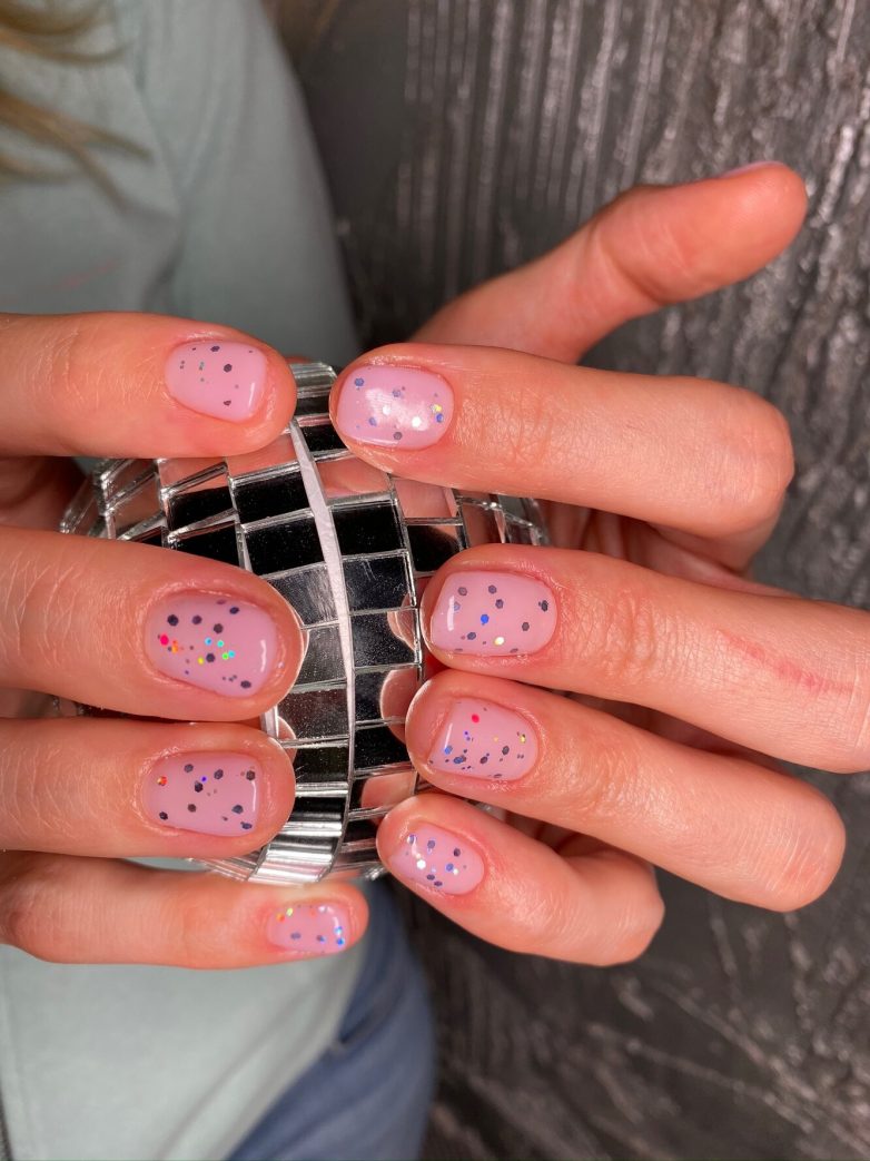 Пожалуй, самый милый дизайн новогоднего маникюра. Словно миллионы разноцветных конфетти взорвались в воздухе и остались на ваших пальцах создавать праздничное настроение. Сами конфетти могут быть разного размера, формы и цветов — будет красиво в любом случае.