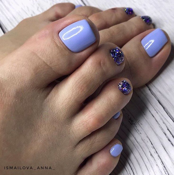 А если выбрать лазурные и голубые оттенки для педикюра, то это больше подходит для летнего сезона. Голубой с добавлением серебра или металлика аккуратно и стильно смотрится на загорелых после отпуска пальчиках.