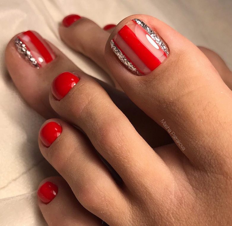 Красный цвет — выбор девушек и женщин, уверенных в себе. Поэтому красный цвет с добавлением блесток смотрится невероятно притягательно и женственно. Такой педикюр идеально подходит для особого случая: романтического ужина со второй половинкой, корпоративной вечеринки, встречи с друзьями и т. д.