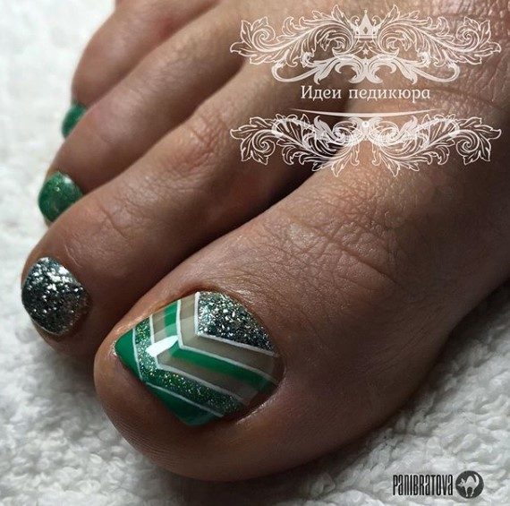 Зеленая палитра содержит множество оттенков, которые смотрятся благородно и роскошно в различных вариантах педикюра. Добавить капельку блеска в виде перламутровой втирки или страз и камушков — и вот уже педикюр выглядит как праздничный вариант.
