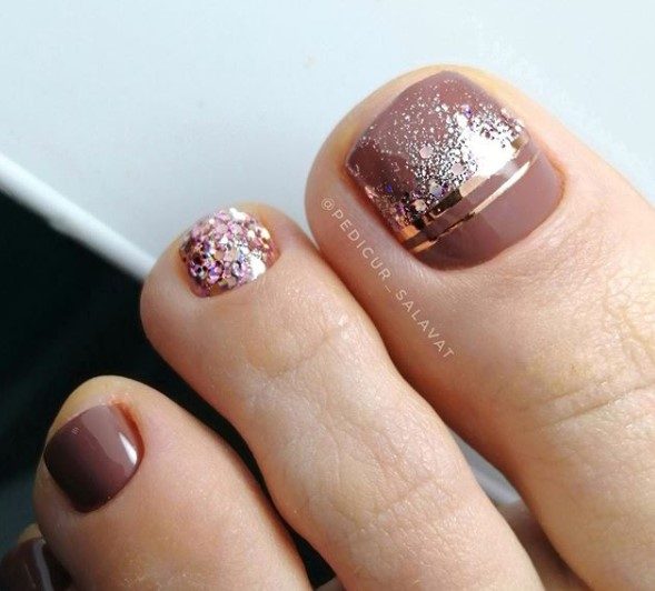 Коричневый и бежевый педикюр с блестками 2021-2022