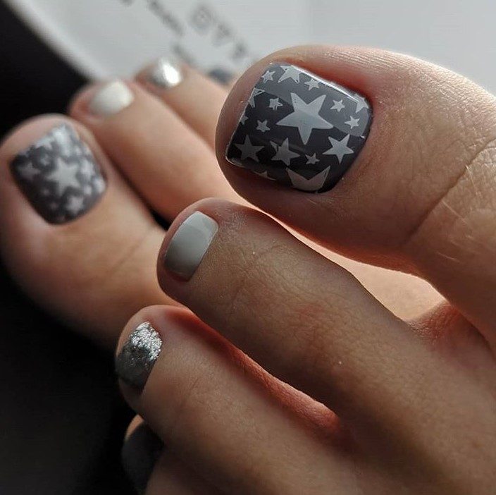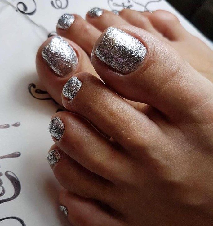 Серый цвет — холодный и спокойный, поэтому при добавления сияния он начинает играть новыми оттенками. Серый педикюр с блестками выглядит очень стильно и особенно подойдет девушкам со светлой кожей и светлыми волосами. Дополнить серый базовый педикюр можно различным декором:шиммеринг; втирка металлических оттенков; украшение стразами или камушками разного размера и формы; блестки поверх базового покрытия.