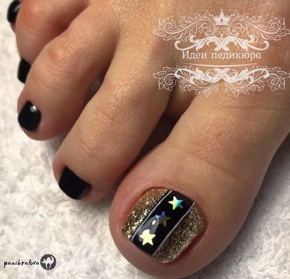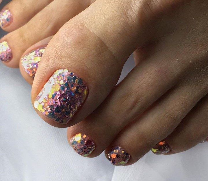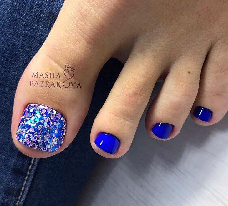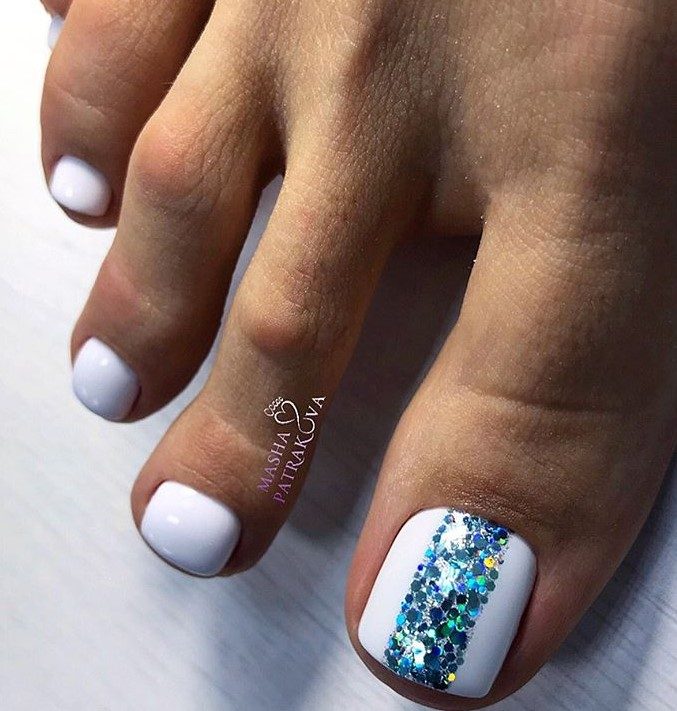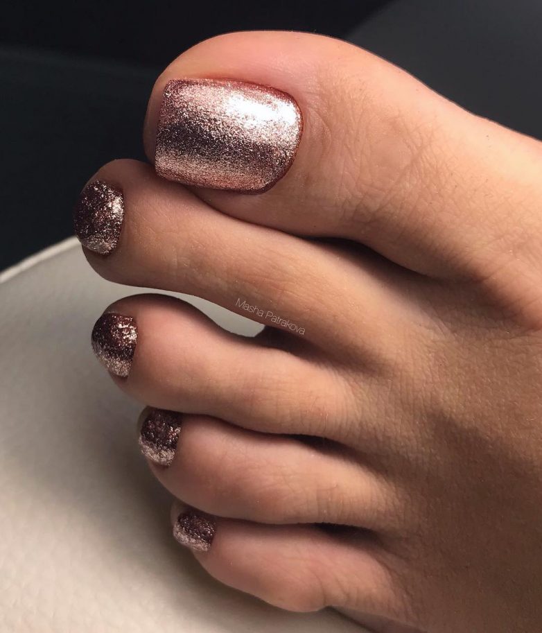 Благодаря появлению новых техник такой нейл-дизайн смотрится оригинально и стильно. С блестящим педикюром любая красавица сможет привлечь внимание, выделиться на мероприятии и подчеркнуть свою индивидуальность.