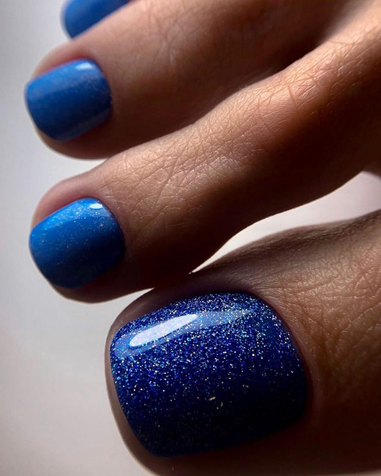 Волшебная синяя палитра для педикюра — рекордсмен по популярности в новогоднюю ночь. И это не удивительно — темно-синий цвет напоминает о магии, чудесах и таинственности женского образа. В сочетании со сверкающим декором синий педикюр смотрится просто невероятно.