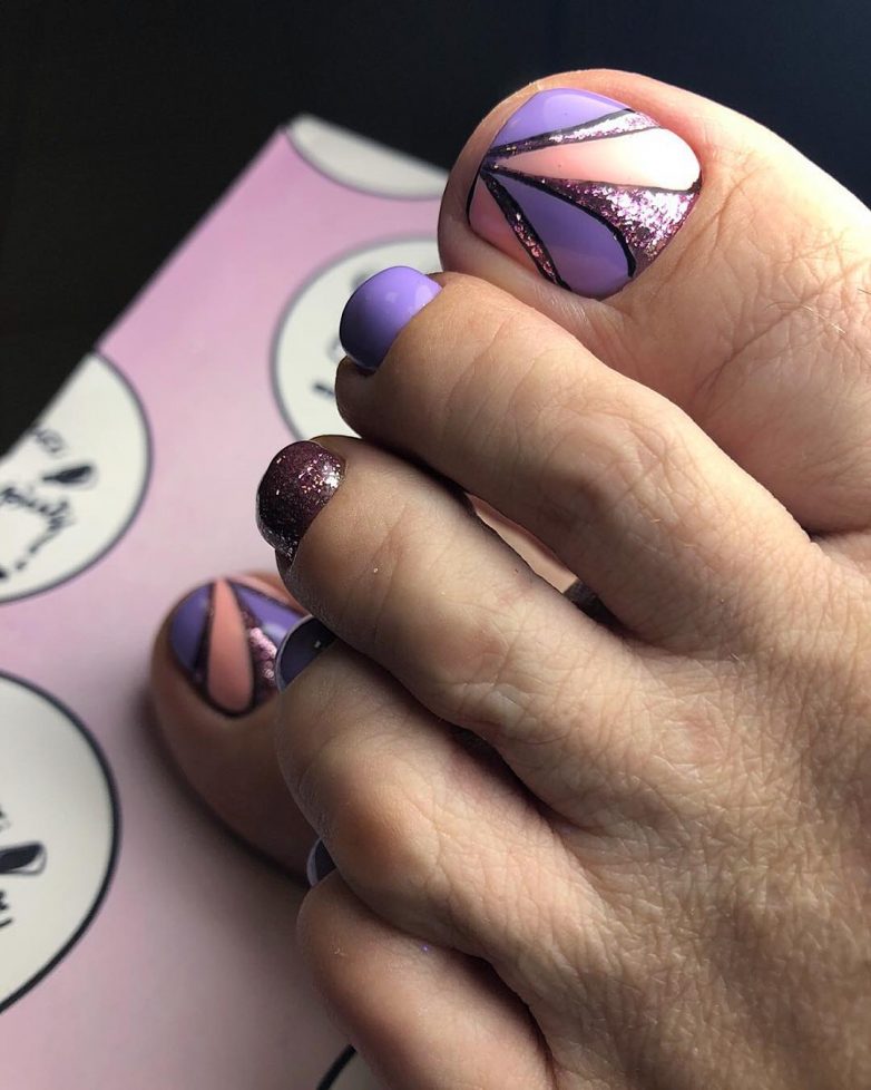 Глубокие оттенки фиолетового привлекают тех девушек, которым близок благородный, женственный стиль в одежде. То же касается и педикюра — фиолетовый педикюр с блестками смотрится роскошно. Сияющий акцент в виде камушков станет пикантной деталью вашего педикюра. Также к фиолетовому педикюру можно добавить различные варианты декора: шиммеринг, металлическую втирку, фольгирование, выполненное в разных оттенках и многое другое. Фиолетовый педикюр можно также сочетать с другими цветами — синим, белым, черным и т. п.