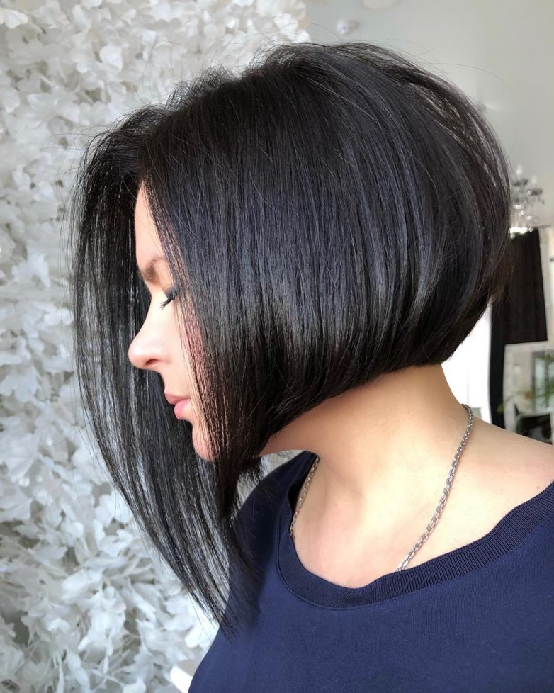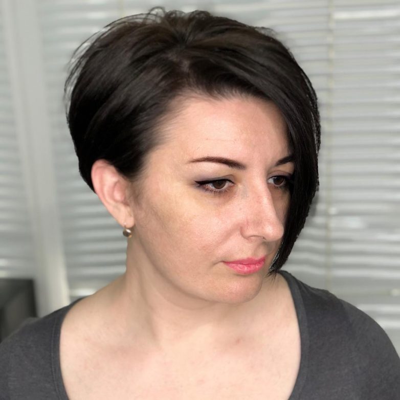 Короткий затылок и удлиненные пряди с одной из сторон лица делают стрижку косой боб необычно привлекательной. Женщине после 40 лет такая стрижка поможет выглядеть молодой, а при помощи простой укладки можно менять образ под любой случай. Кстати, красиво обрамленные пряди возле лица очень хорошо корректируют овал.