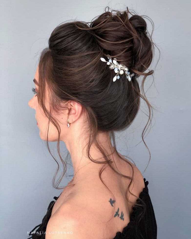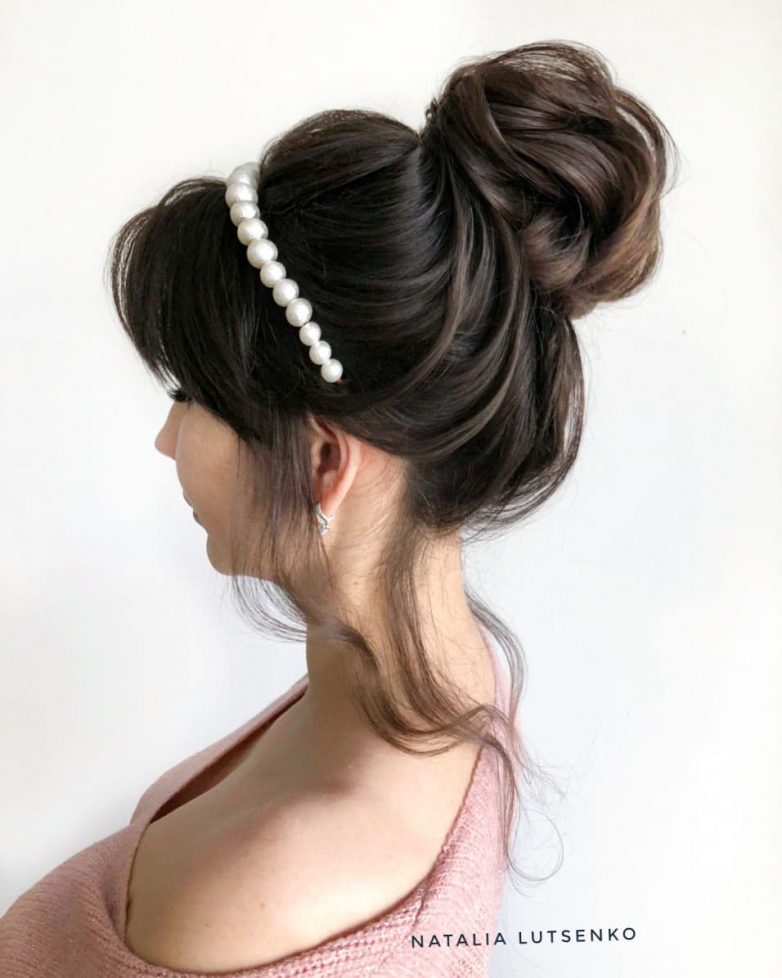 Чаще всего пучок в торжественном оформлении выбирают женщины для новогодних корпоративов или празднования Нового года в условиях ресторана или клуба. При формировании пучка главной особенностью являются несколько выпущенных прядей возле лица. Украшения в виде разнообразных аксессуаров сделают прическу еще более яркой и праздничной.