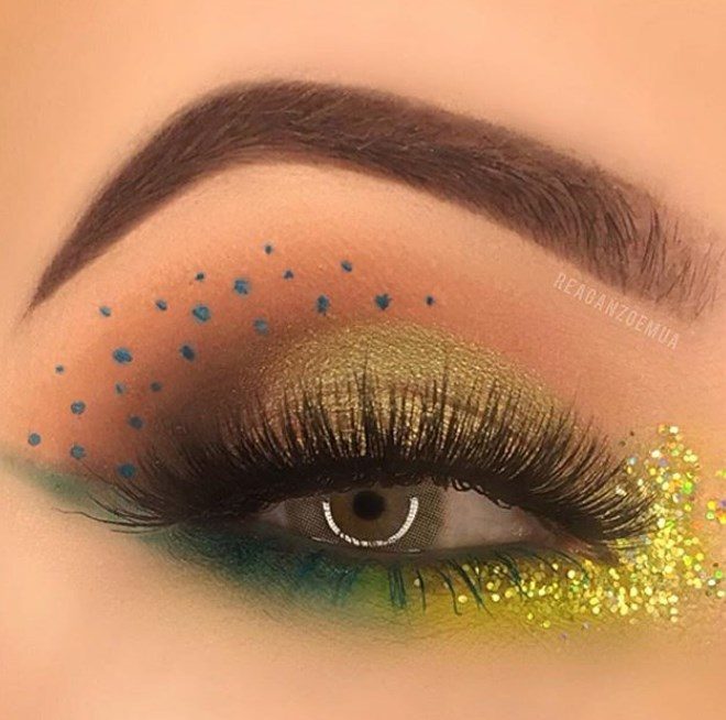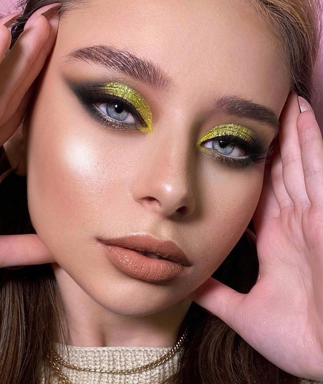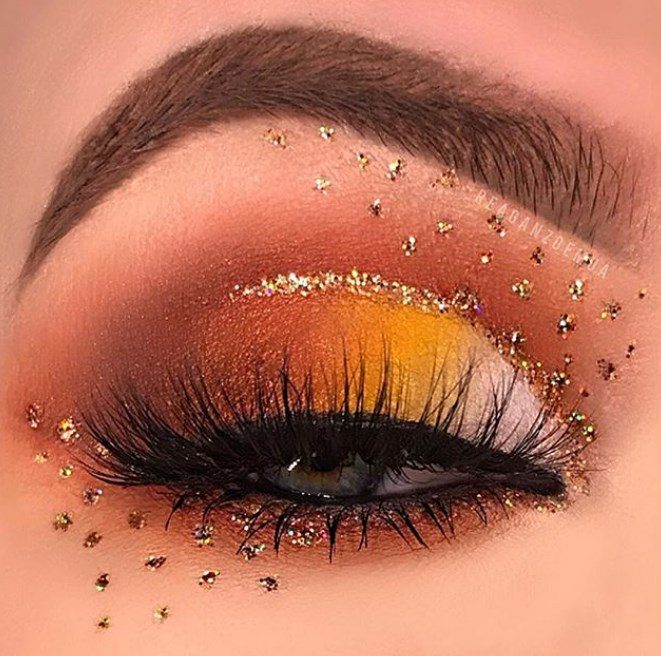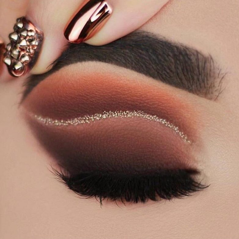 В бьюти-трендах 2021 года множество ярких вариантов праздничного макияжа для обладательниц карих глаз:мейкап в кислотных оттенках; палитра металлик; огненный, дерзкий мейкап; бронзовая палитра.