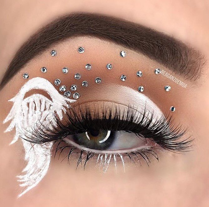 Праздничный макияж для голубоглазых девушек практически не ограничивается ничем: вы можете смело экспериментировать и использовать подводки яркого цвета, графичные массивные стрелки, белый акцент во внутреннем уголке глаз. Без внимания в трендах 2021 года не остаются декоративные варианты: блестки, тени с эффектом шиммеринга, стразы и камушки, наклейки.