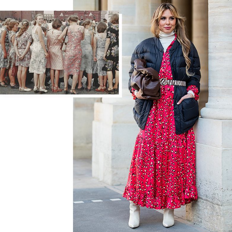 Цветочные ситцевые платья «гремели» все лето, однако модницы нашли способ, как их носить и зимой. Платья надевают поверх тонких водолазок с высоким горлом или накидывают на них худи, толстые вязаные свитеры или шерстяные кардиганы.