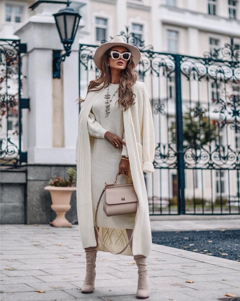 Прекрасная нюдовая палитра позволяет модницам выделить свой женственный образ. Платья, пальто, брюки, кофты и блузки в этом оттенке смотрятся очень нежно и достаточно строго, что дает возможность собрать самый романтичный лук для офиса.