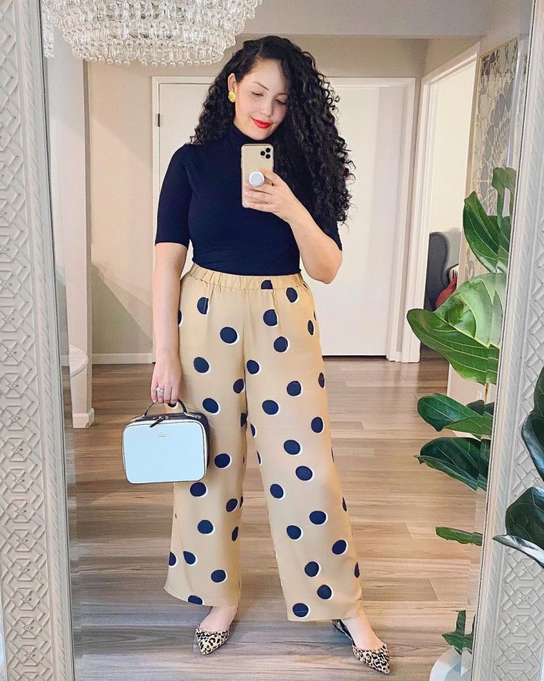 Если все-таки хочется добавить этот принт в образ, то нужно отдать предпочтение мелкому гороху и однотонным плотным тканям.