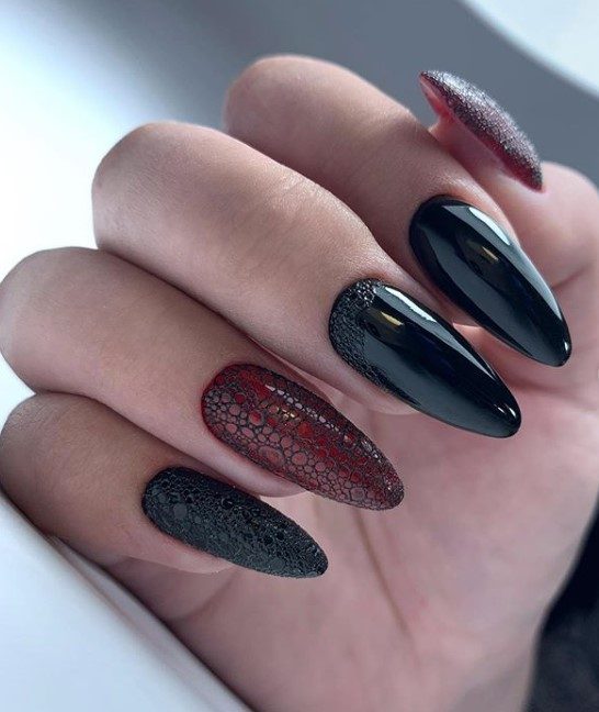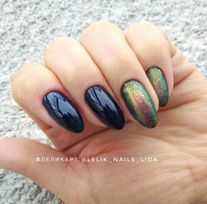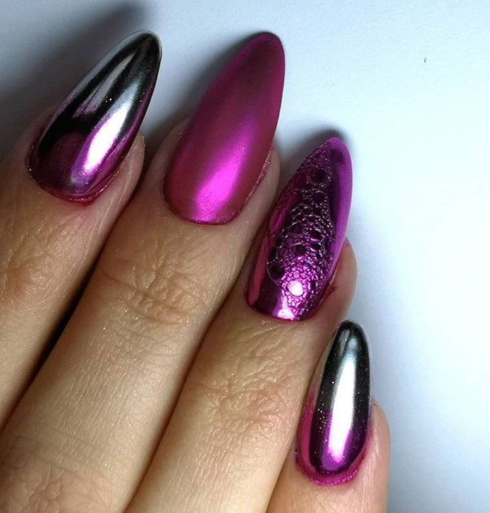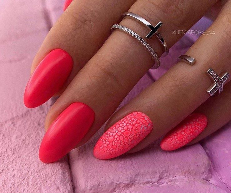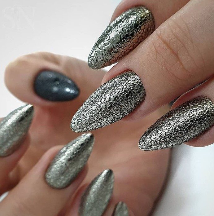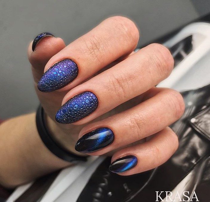 Пузырчатый рельеф может покрывать поверхность одного ногтя или абсолютно всех. Выделите один или два пальца, сделав на них отличающийся от остальных маникюр.